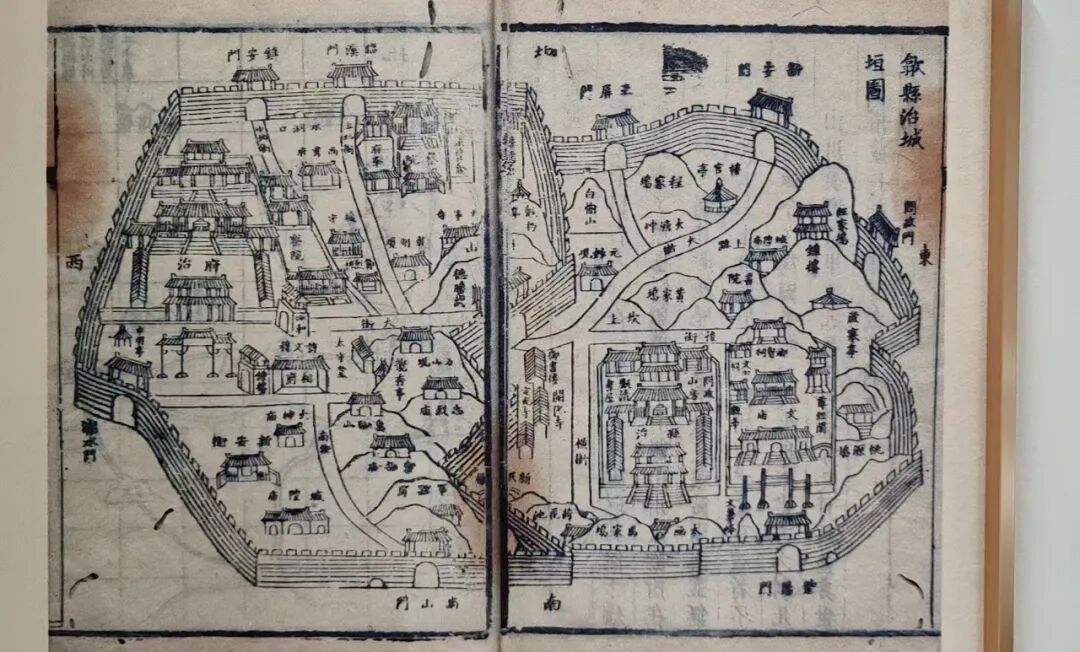 黃山檔案館館藏《圖說(shuō)》便是這一風(fēng)尚的典型產(chǎn)物。此套版畫(huà)共24幅,描繪歙縣山川勝景,原為清康熙二十九年(1690)歙縣知縣靳治荊編修《歙縣志》時(shí),請(qǐng)歙縣上杲(今屬徽州區(qū))畫(huà)家吳逸繪制,由名工黃松如、黃正如鐫刻而成。其構(gòu)圖純?nèi)粐?guó)畫(huà)風(fēng)骨,重巒疊嶂,筆墨靈動(dòng)。原版后由歙縣潛口汪氏水香園珍藏,并于乾隆二十二年(1757)以單行本的形式重印一冊(cè),題名為《古歙山川圖》。